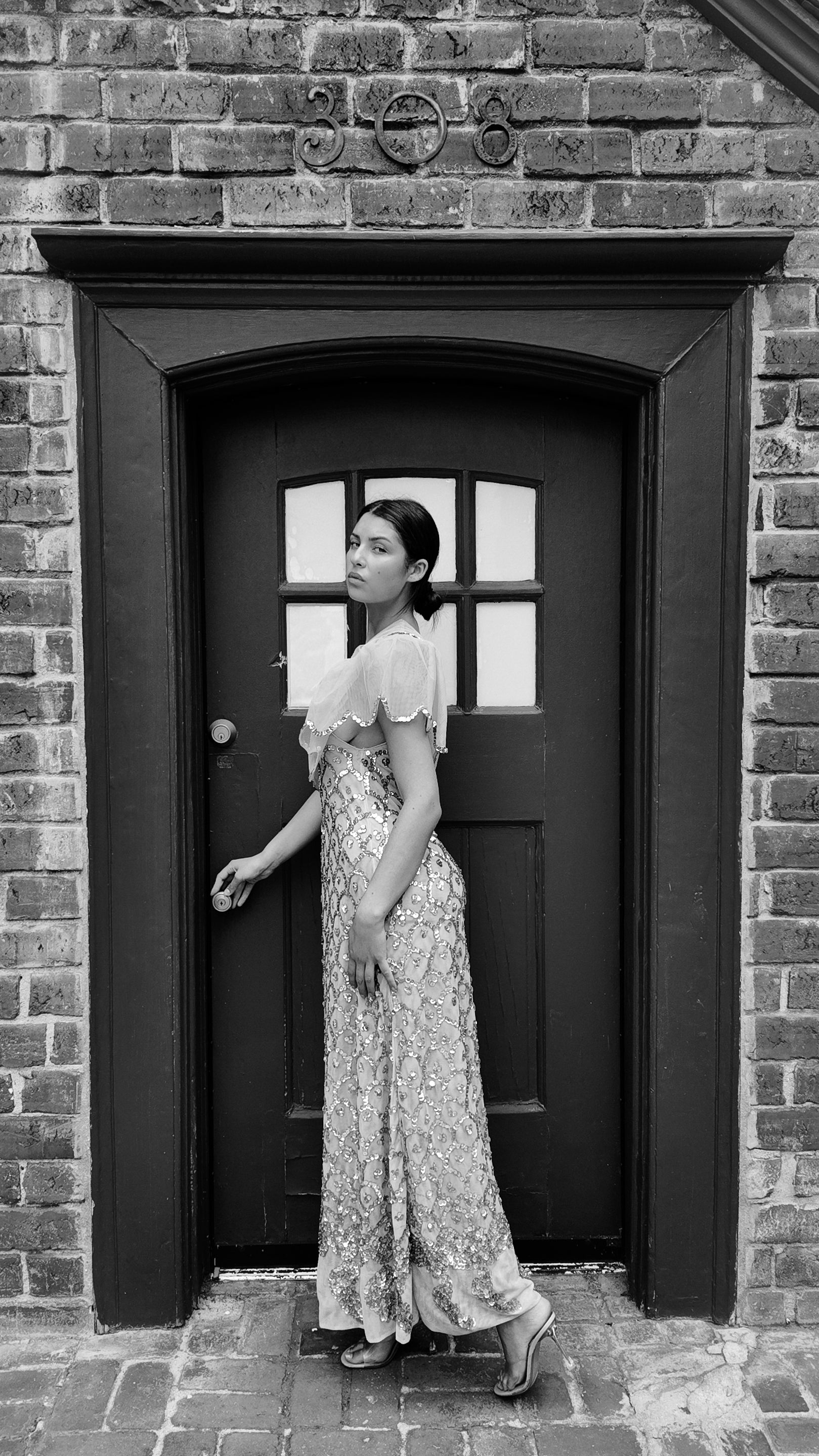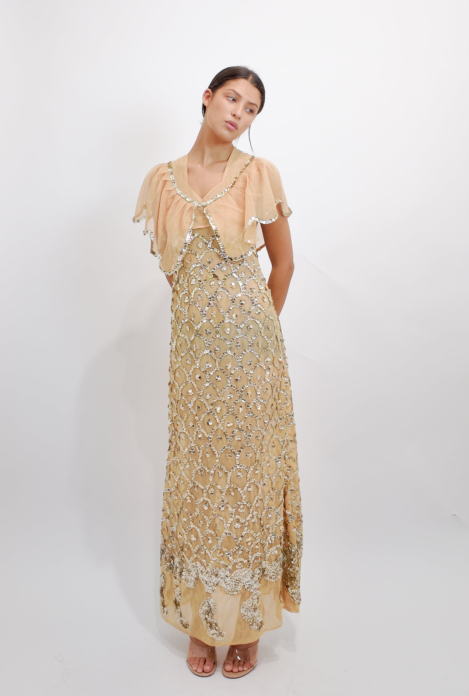 This exquisite 1970’s French custom dress is richly adorned with silver sequins, creating a luminous effect that captures light gracefully. Designed with a delicate scalloped bib detail, it offers a refined silhouette perfect for a bride or any distinguished special occasion. Its nude base complements the shimmer, delivering a timeless, sophisticated elegance tailored for unforgettable moments.