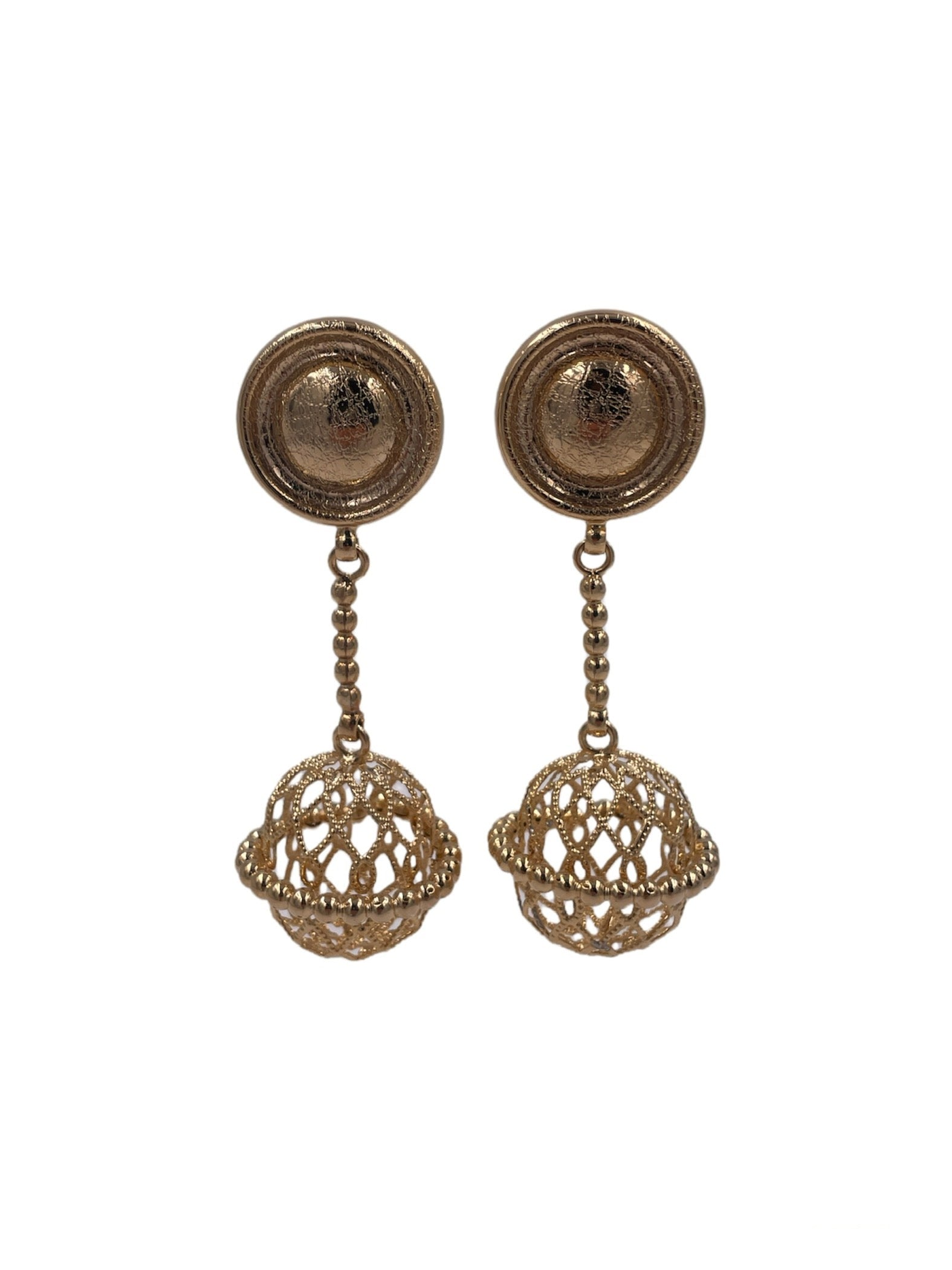 Elegant yet unique. These earrings feature a simple gold medallion with that leads to a dangling cage. Throw these on with a gown fit for the runway or with jeans and a blouse for a simple yet elevated look.