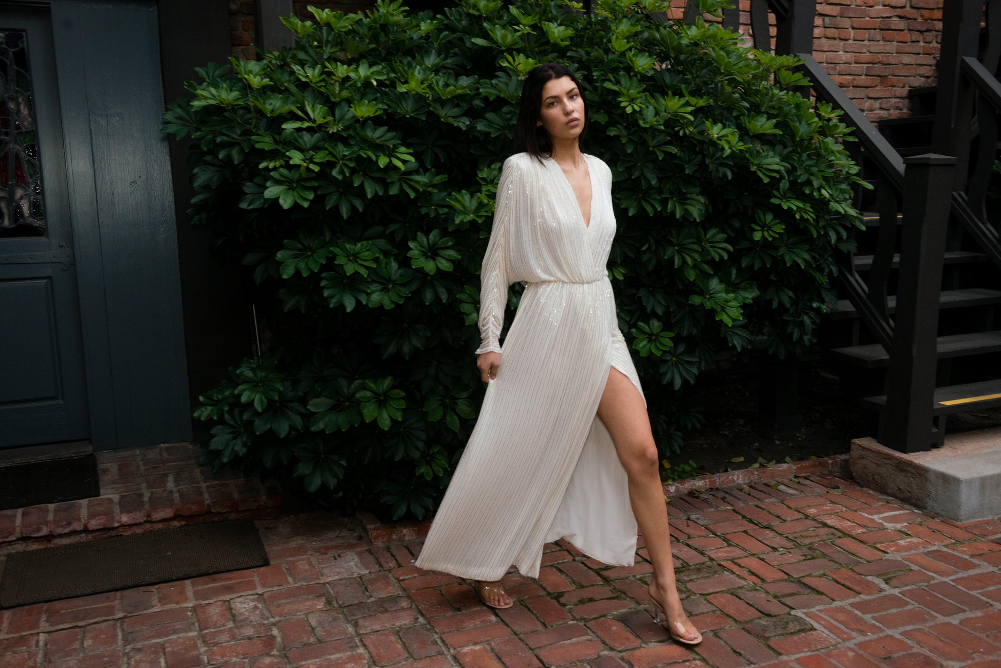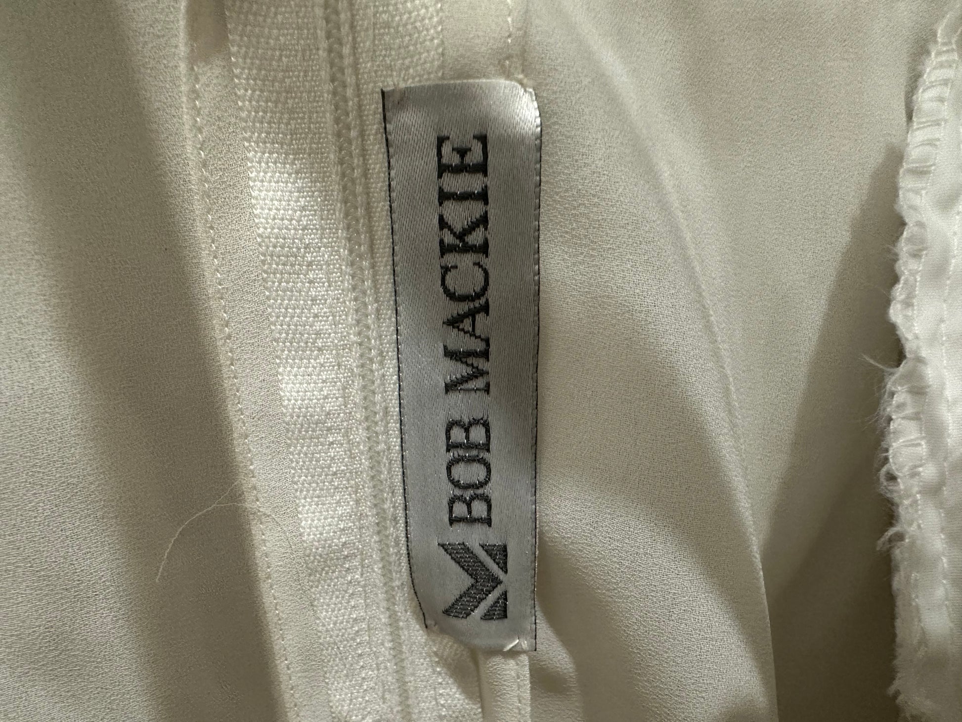 This exquisite Bob Mackie creation epitomizes 1970s glamour with its pristine white silhouette and intricate white and silver bugle beadwork. The elegant V-neckline and flowing long sleeves offer timeless sophistication, while the fully beaded construction catches light with every movement. Versatile enough for bridal moments or elevated evening & special occasions, this gown showcases Bob Mackie's signature craftsmanship and attention to detail. A statement piece that transcends decades, perfect for those seeking refined, show-stopping elegance.