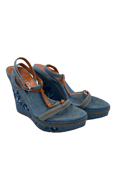 A beautiful classic wedge sandal from Dior. The denim fabric with stunning unique floral embroidery will have you walking on cloud nine. Classic "C' and "D" letter detail on each shoe for subtle logo mania.