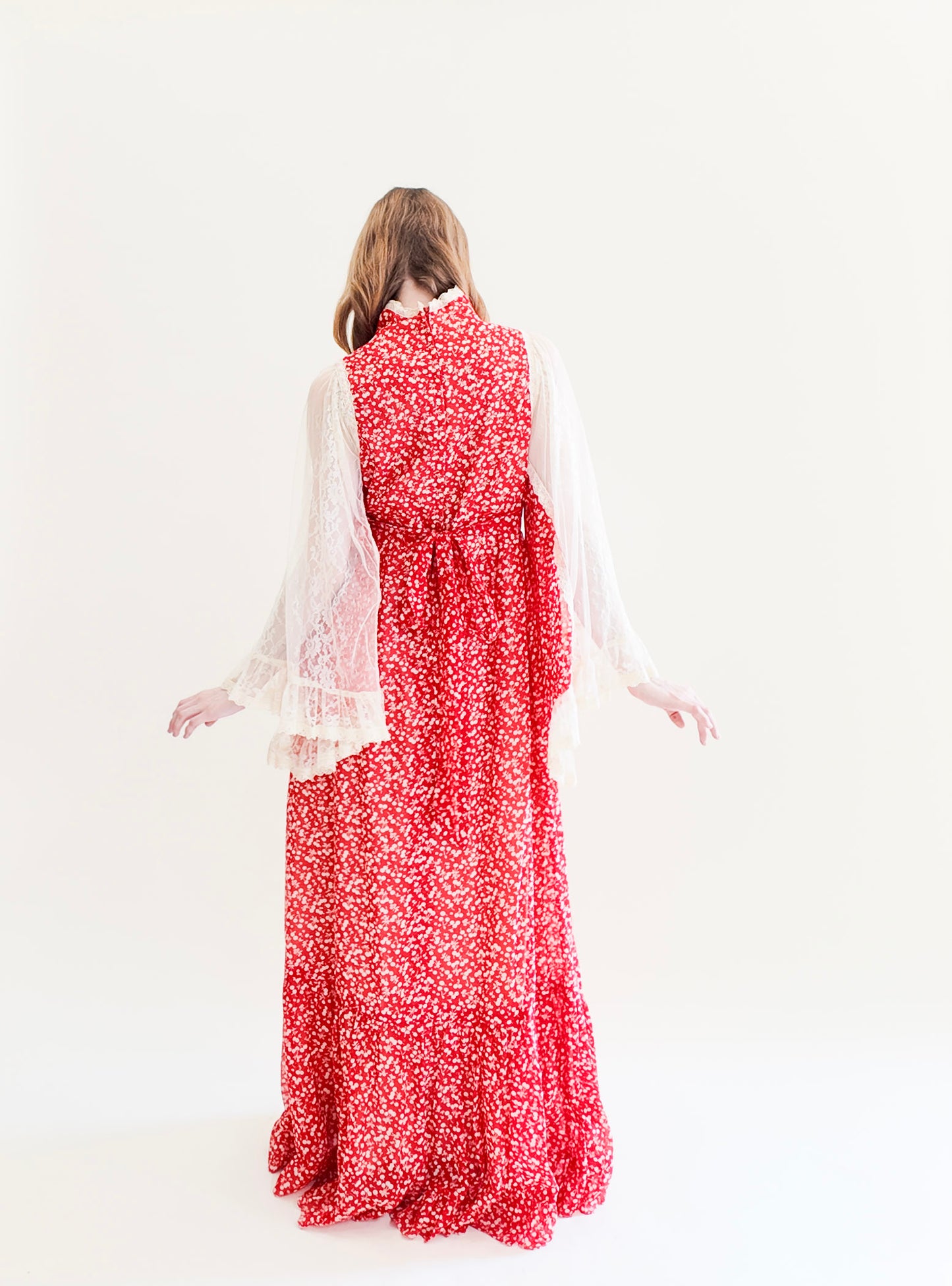Elevate your spring fashion game with our Vintage Gunne Sax Red Print Lace Bell Sleeve Prairie Dress. This stunning maxi dress features charming bell sleeves and a striking red cherry printed fabric. Embrace a casual and effortlessly chic look with this vintage prairie dress.