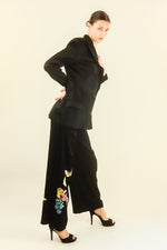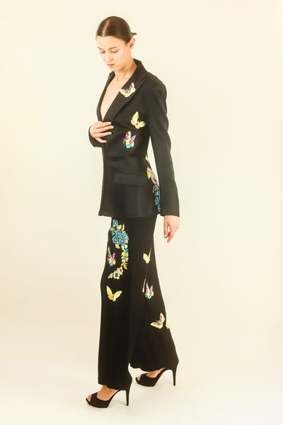 This suit by John Galliano is the ultimate cheerful satin suit that will make you stand out from the crowd. Embroidered with florals and butterflies, this suit is perfect for springtime events- day or night. Wear for a wedding, date night or brunch party with a colorful blouse and platform heels.