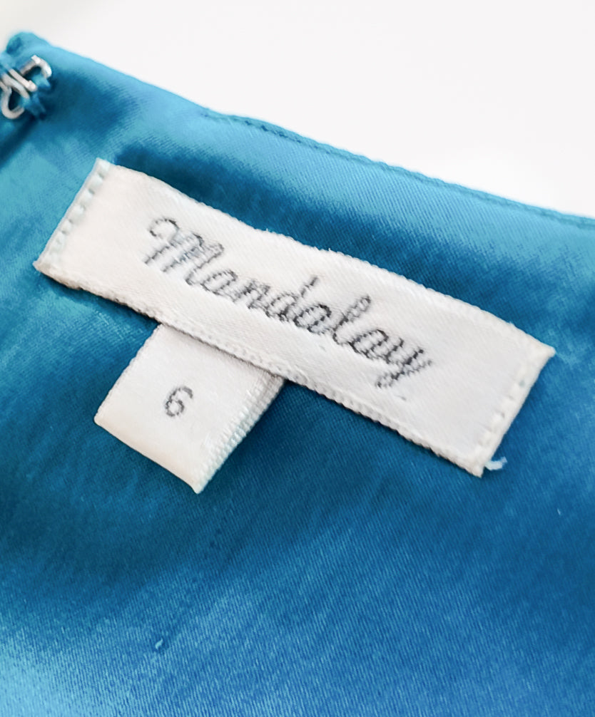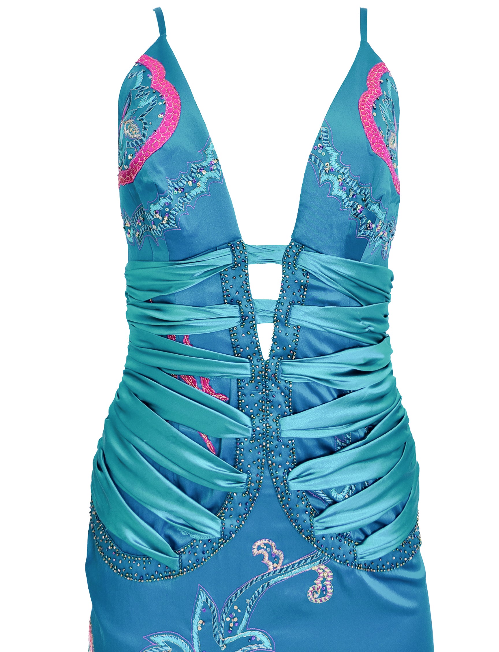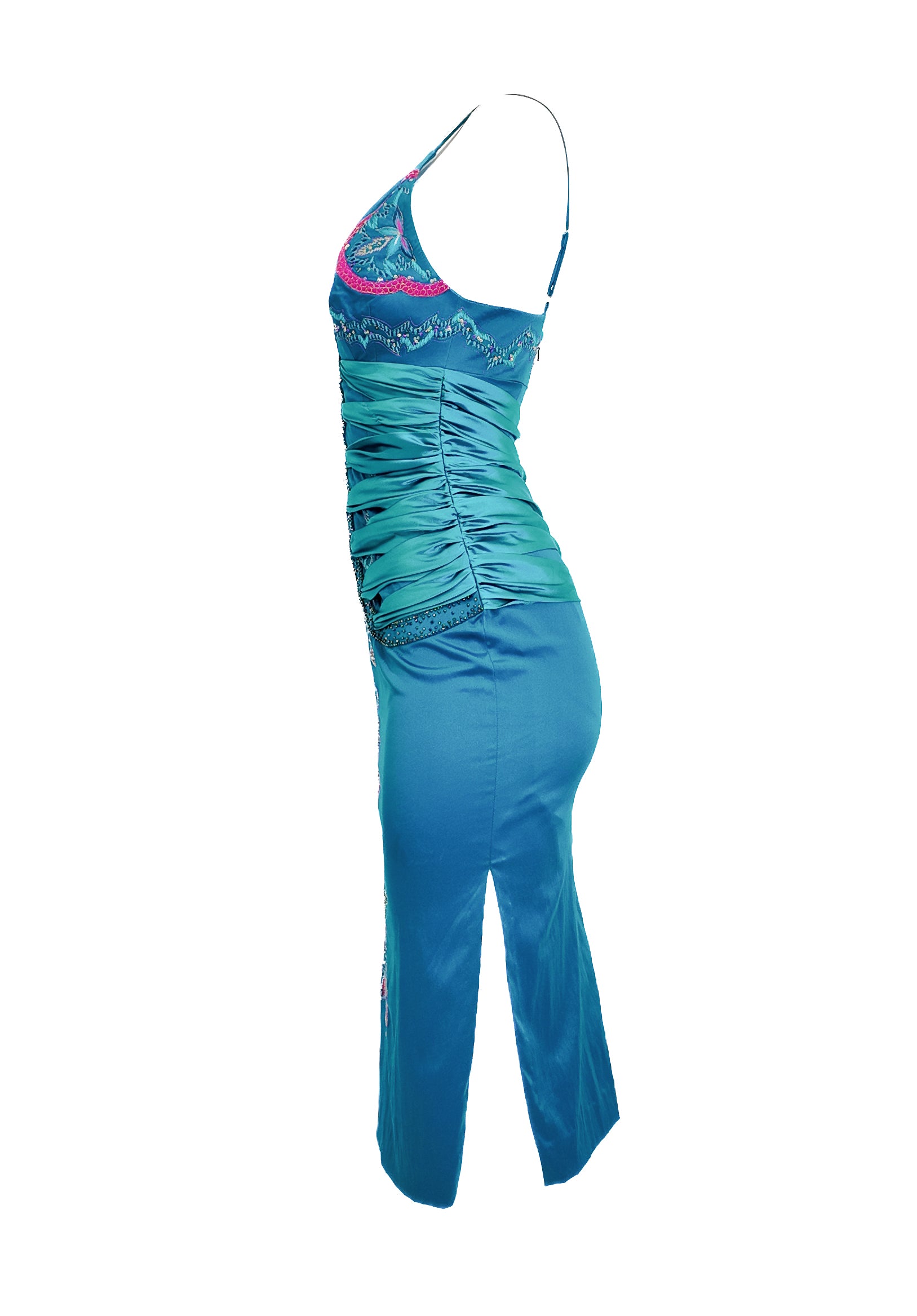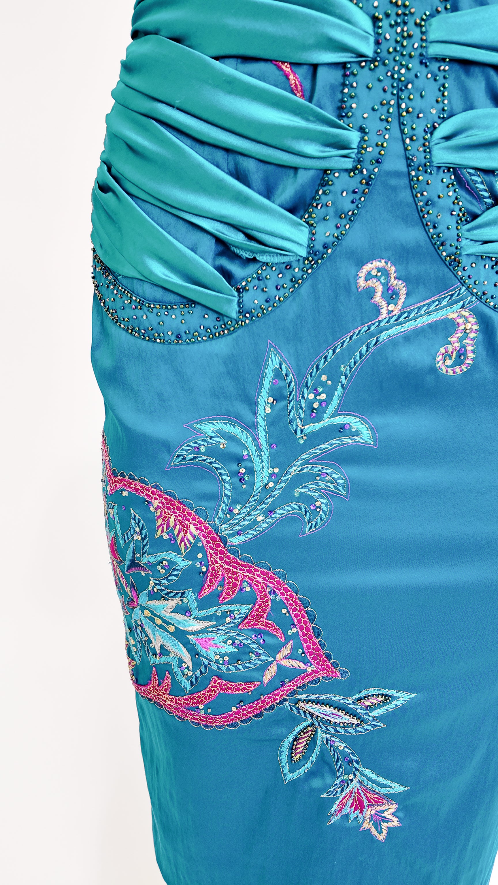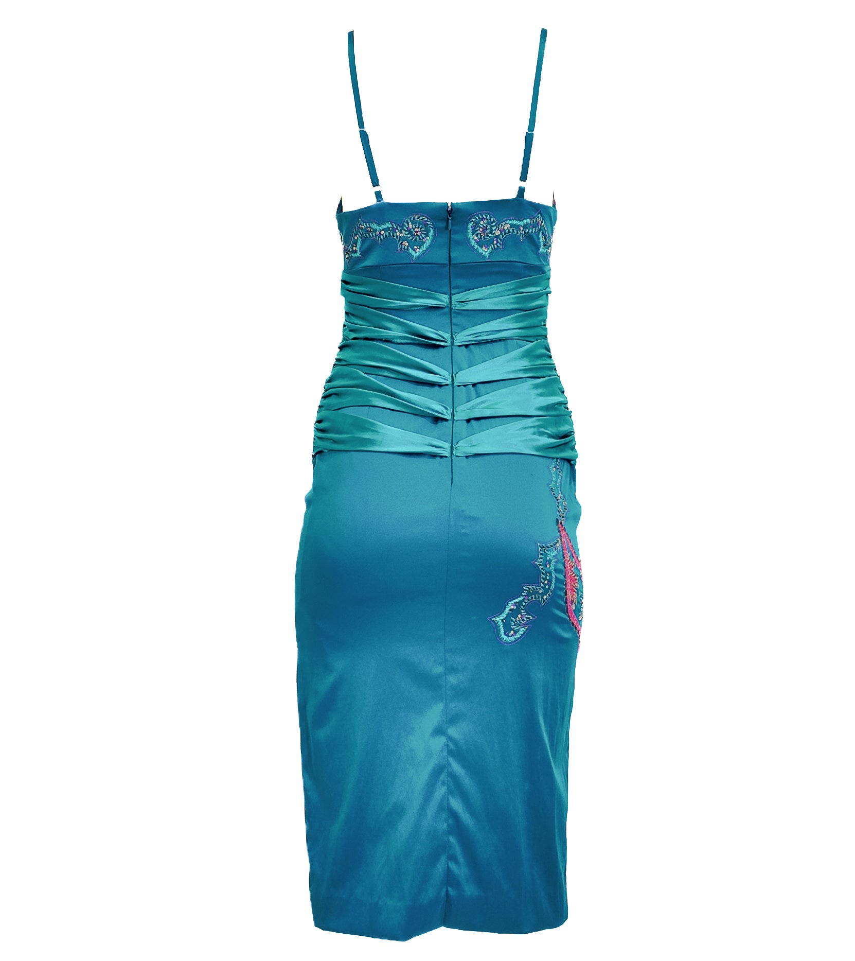 Mandalay 2004 Satin Turquoise Embroidered Midi Cocktail Dress