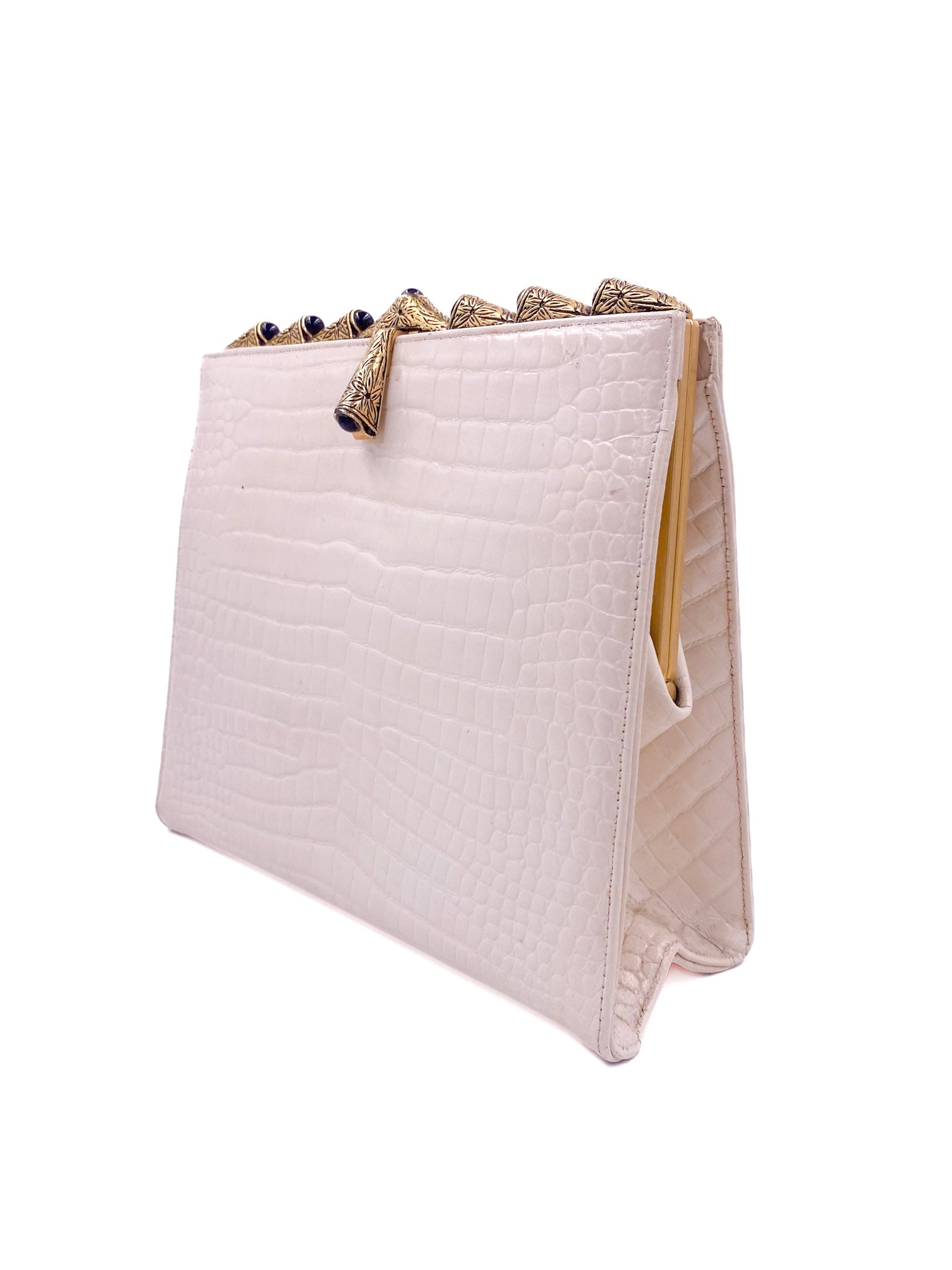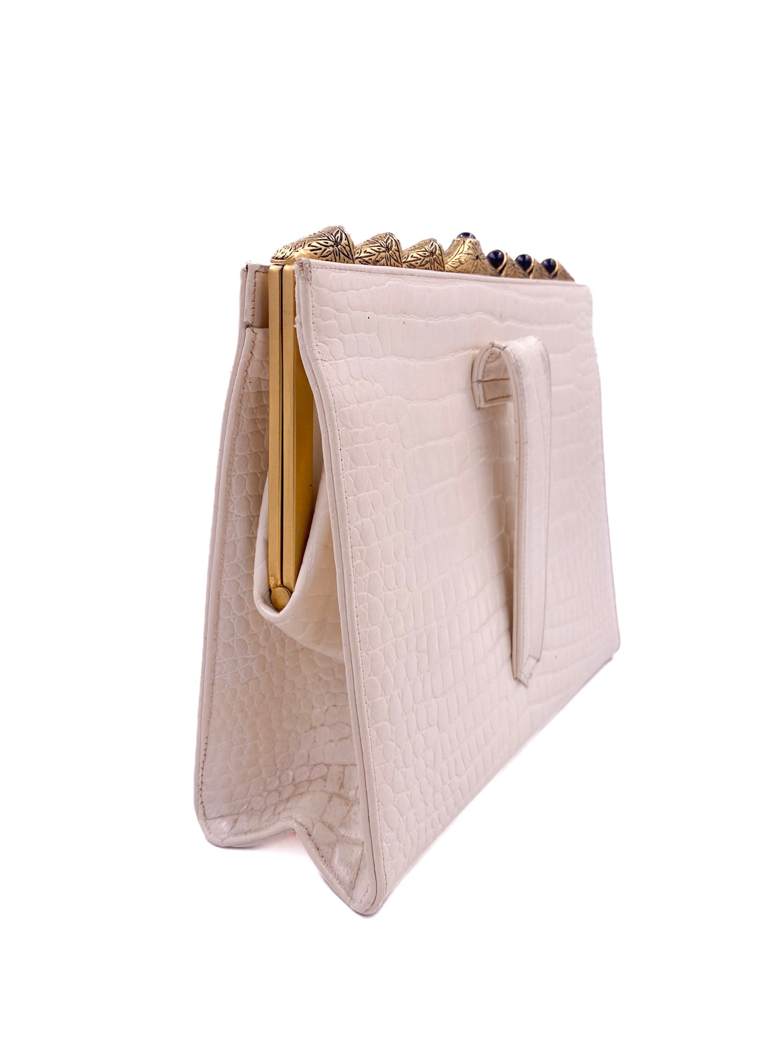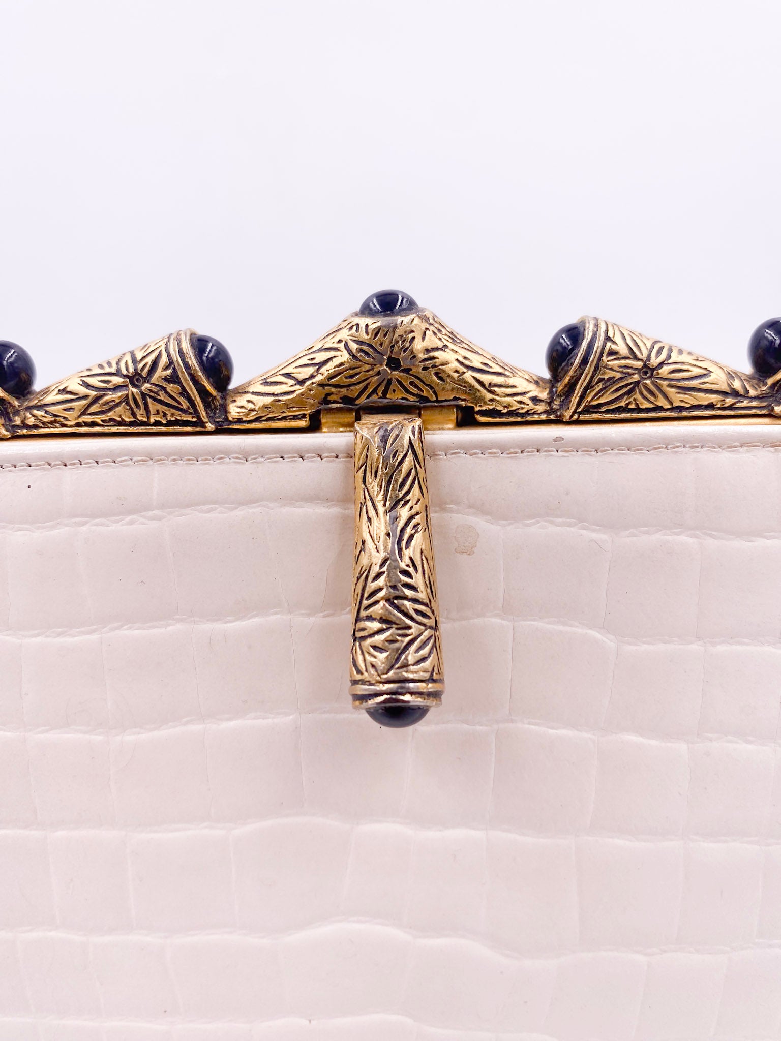 This vintage clutch features cream leather with a distinctive crocodile texture, complemented by a gold floral engraved trim handle adorned with a black stone detail. Designed with a convenient handle on the back, it offers both style and functionality. The interior is lined with black leather and includes a mirror, making it an elegant accessory for sophisticated occasions.