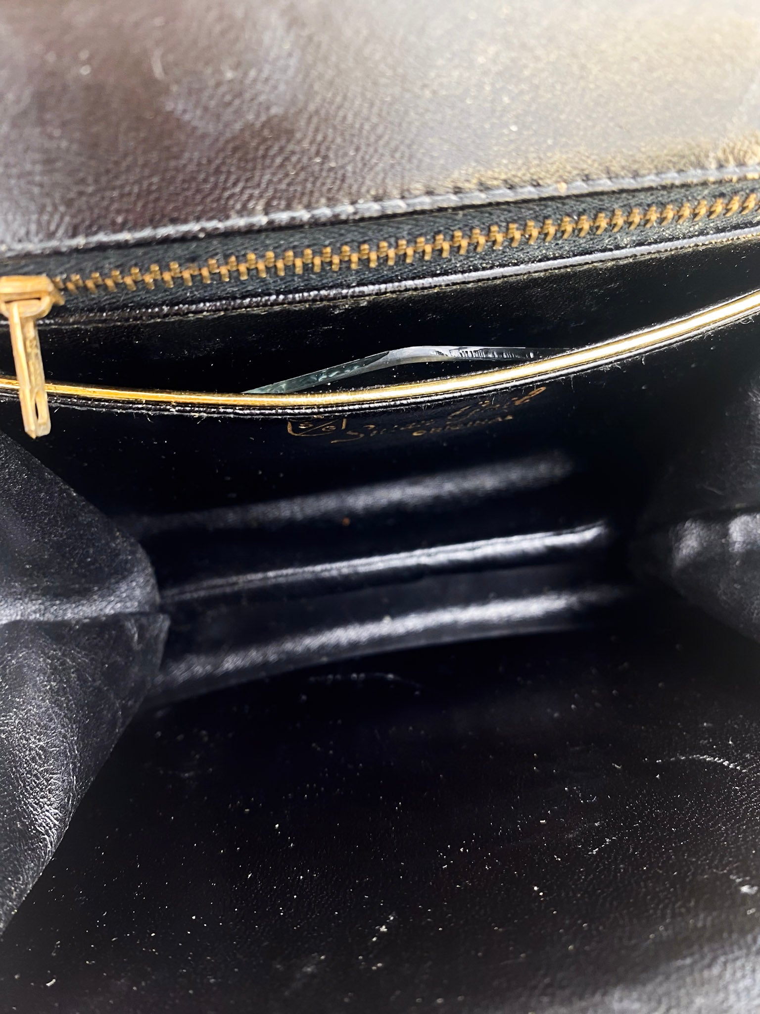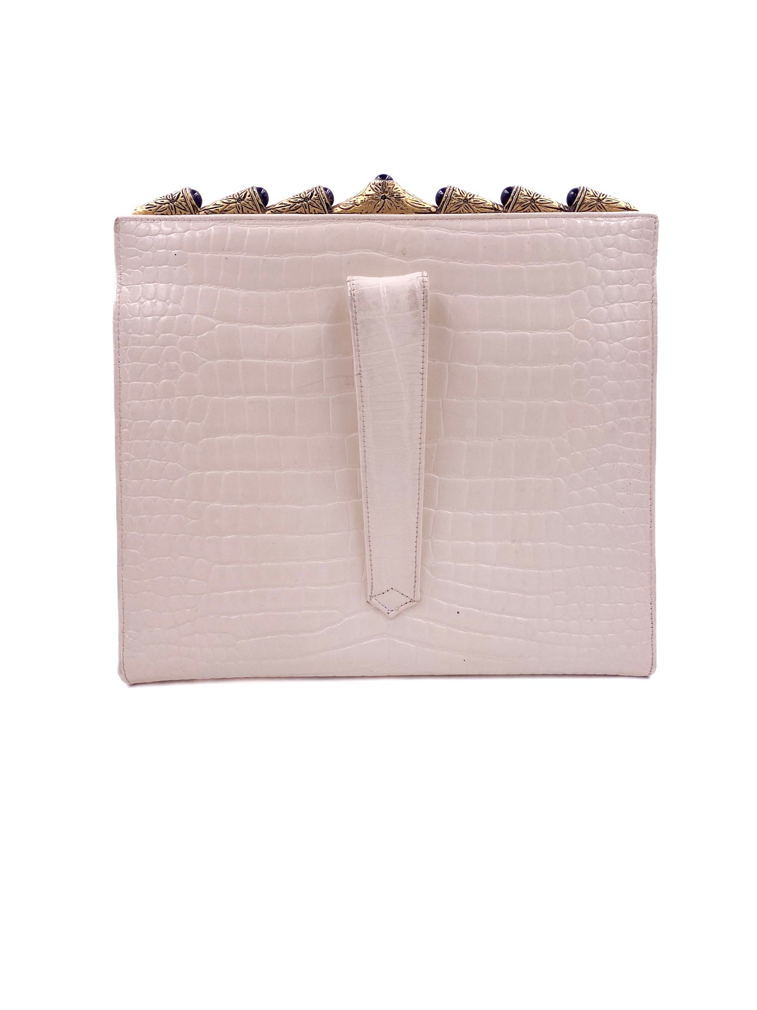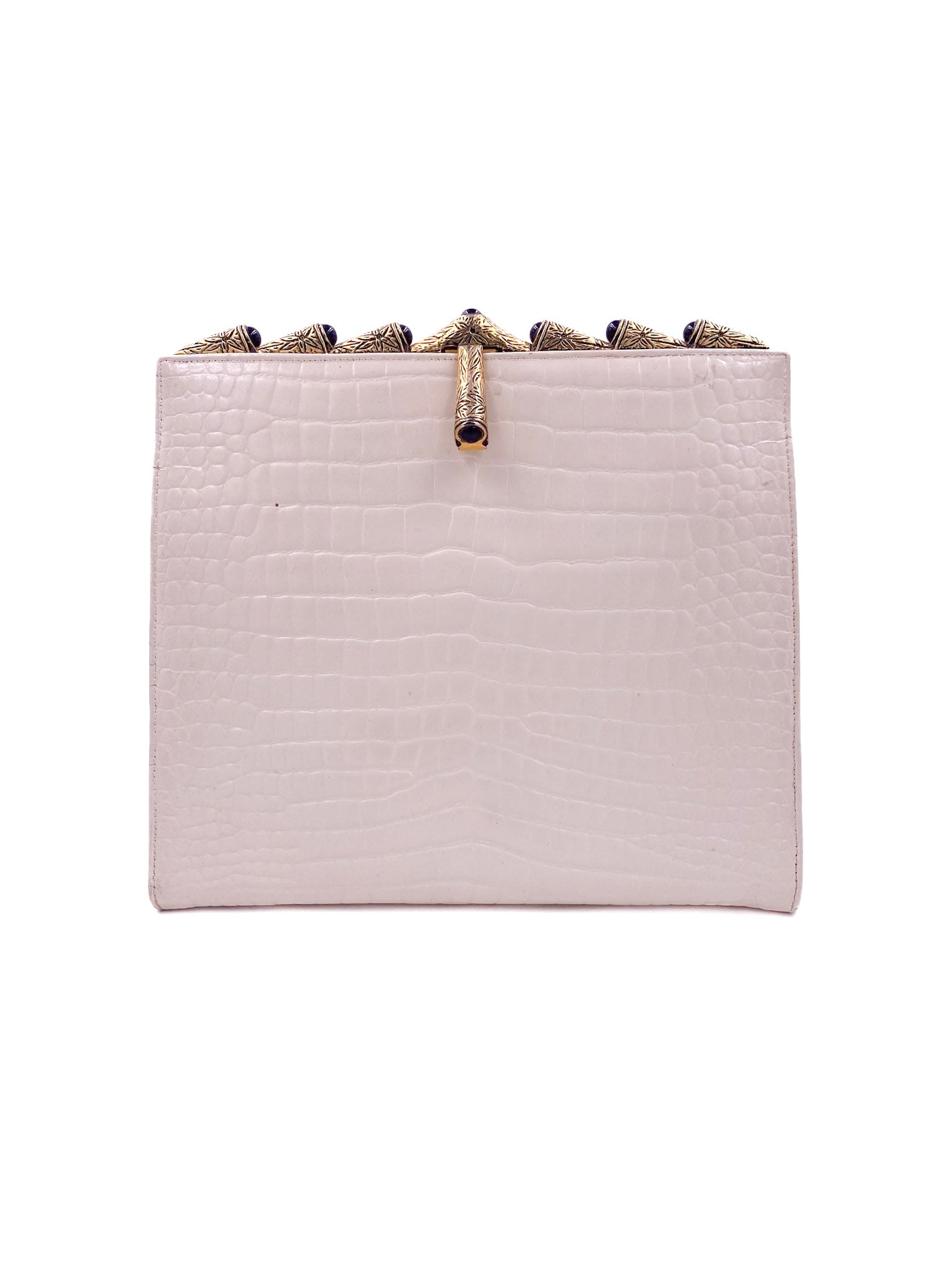 This vintage clutch features cream leather with a distinctive crocodile texture, complemented by a gold floral engraved trim handle adorned with a black stone detail. Designed with a convenient handle on the back, it offers both style and functionality. The interior is lined with black leather and includes a mirror, making it an elegant accessory for sophisticated occasions.