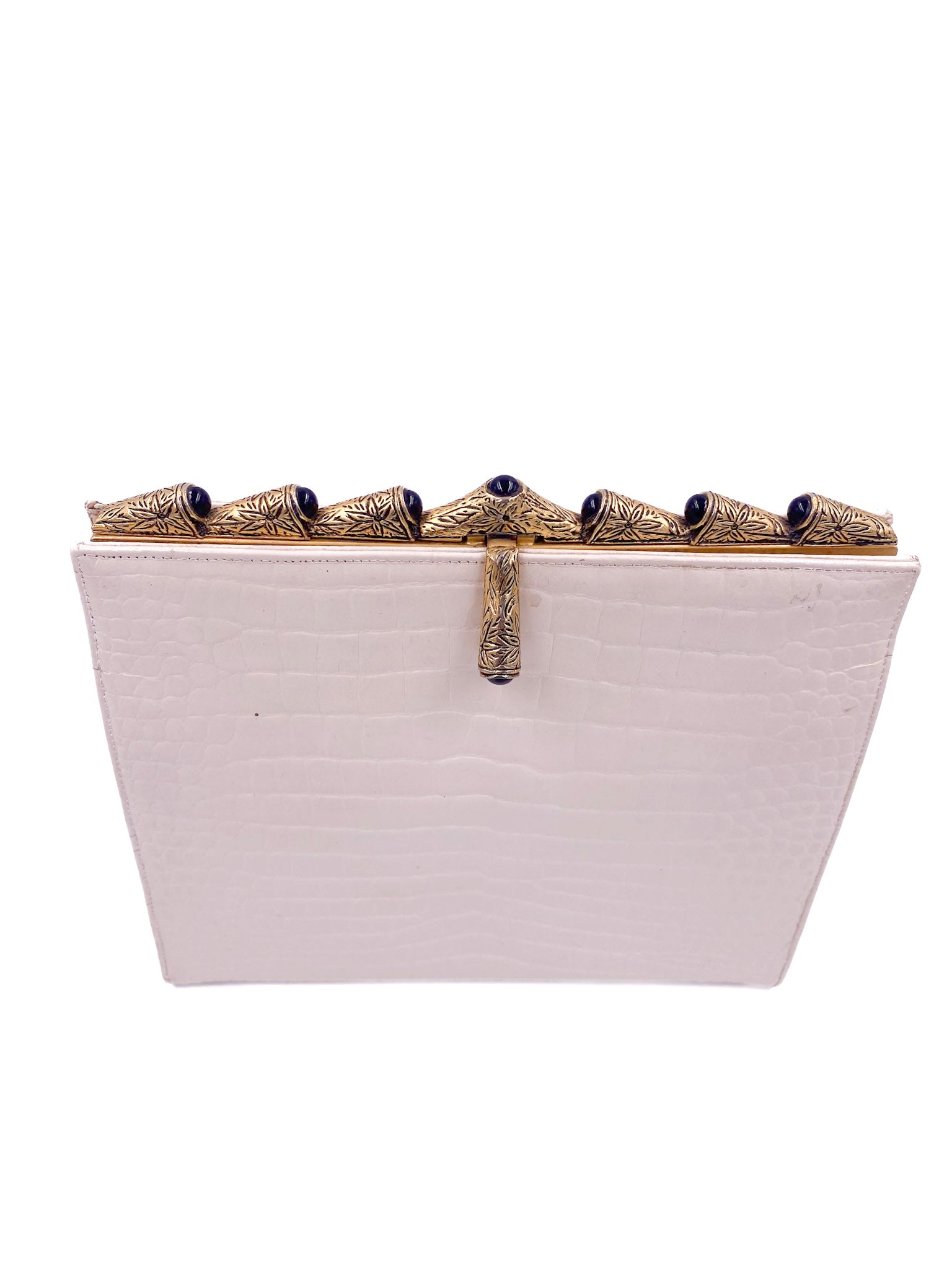 Vintage Susan Gail White Faux Clutch Crocodile Texture With Gold Trim Handle