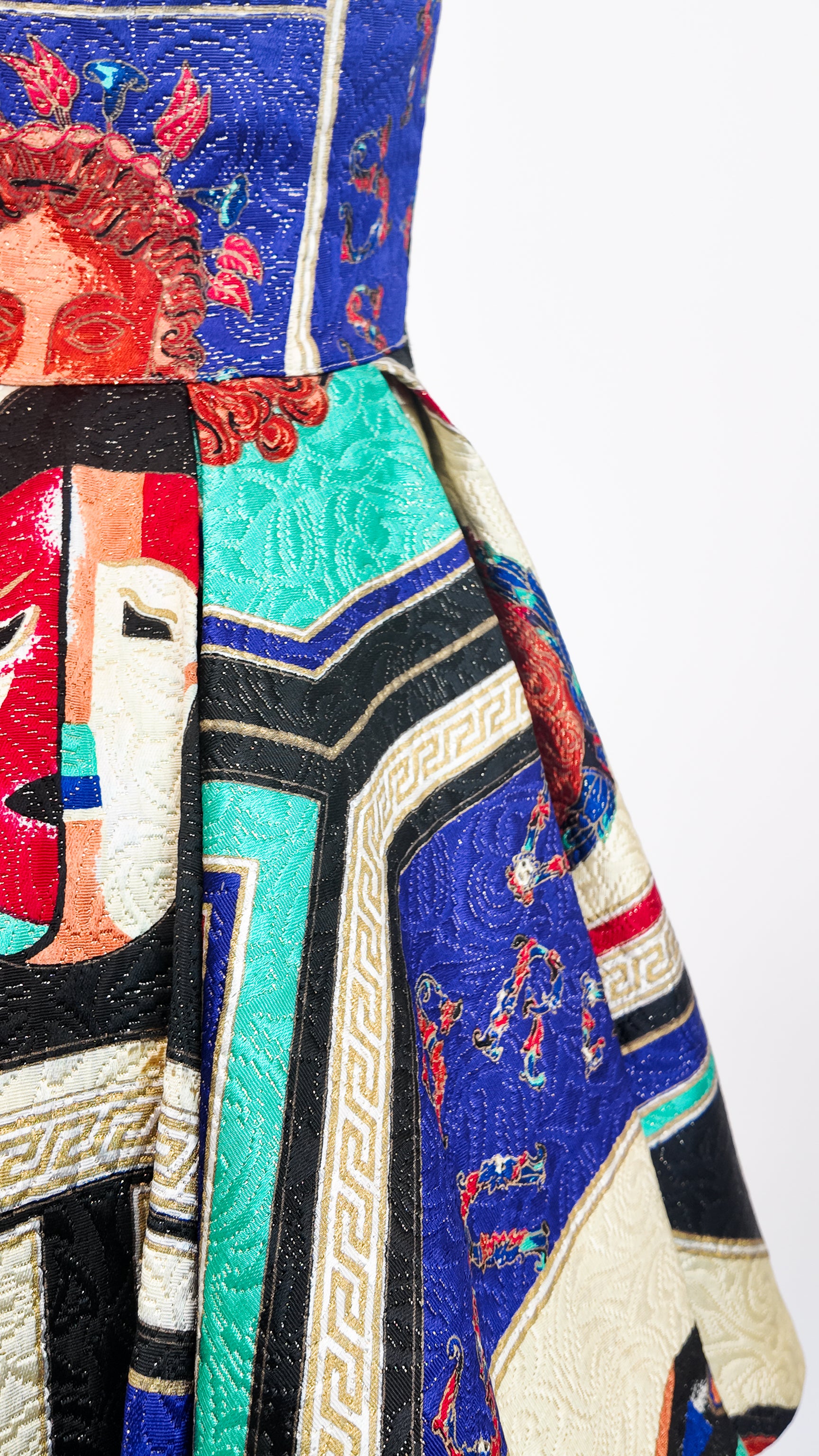 The Versus by Gianni Versace 1992 Masque Matelassé Dress is a sophisticated tribute to masquerade elegance. Crafted from matelassé silk lamé, this fit-and-flare mini dress features a striking harlequin-inspired pattern with bold graphic mask motifs and geometric color-blocking. A gold lamé tulle crinoline underskirt adds volume and movement, enhancing its dramatic silhouette. Perfect for those seeking a statement piece that blends vintage allure with artistic craftsmanship.
