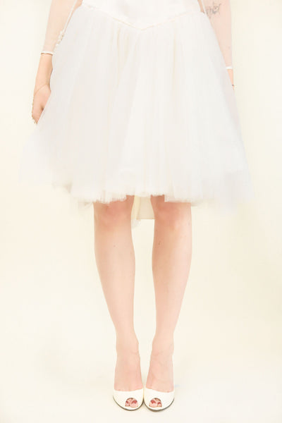 Ballerina chic meets the vintage bride. This dress is unlike anything else. Celebrate love in this fun dancer-style cocktail dress. Style with a pair of white heels and dangling crystal earrings.