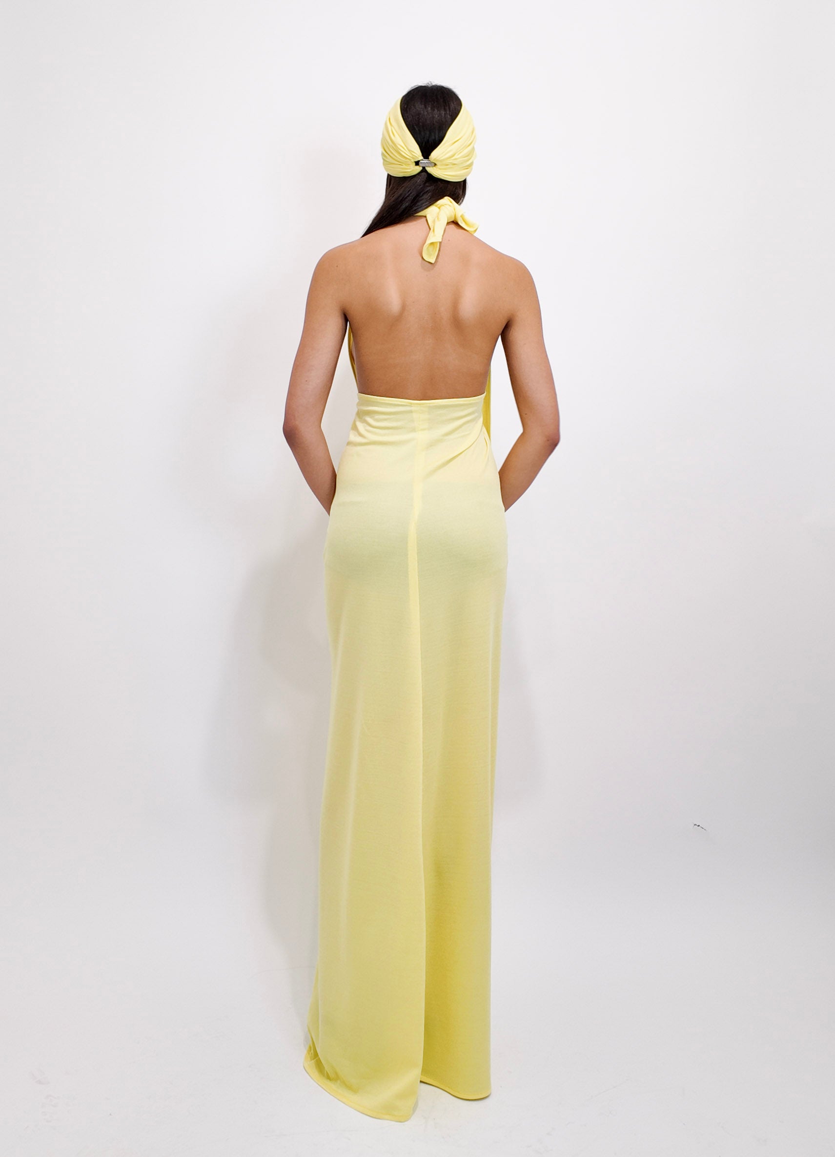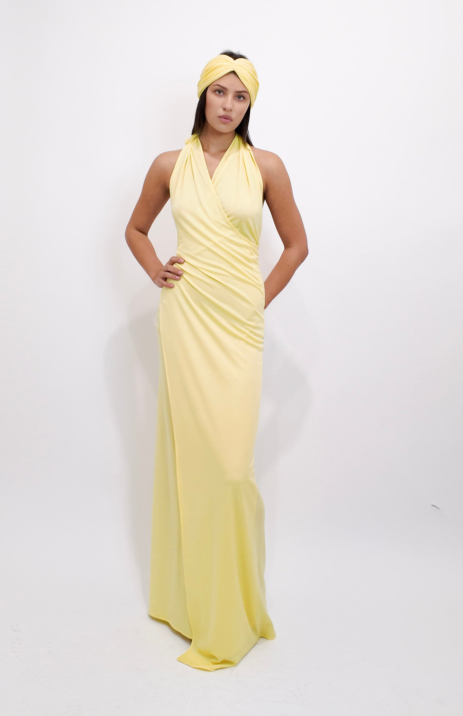 Capture the essence of the 1970s with this yellow jersey halter wrap dress and matching turban set. Designed for versatility, its stretchable fabric adjusts to fit various body types comfortably. Perfect for summer days or layered with a fur coat in winter, this set effortlessly transitions from casual daytime wear with sandals to an elegant evening look with heels. Embrace a stylish, nostalgic journey with an easy-to-wear dress that's both flattering and functional.